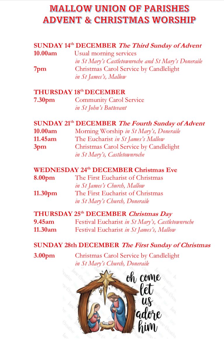 One of the highlights of the year in the Union are the two Christmas Concerts which will be held in St James’s Mallow on December 12th and 13th. At the time of writing the tickets are going very well. These concerts have been very popular with the local community and beyond and feature very talented musicians and singers from the locality. Thank you in advance to the organising committee, chaired by Jillian Harris, and the many volunteers who have given of their time and talents to make this annual event a success. See ‘St James’s Church Mallow’ Facebook page, and Mallow Union of Parishes website for details https://mallow.cloyne.anglican.org
